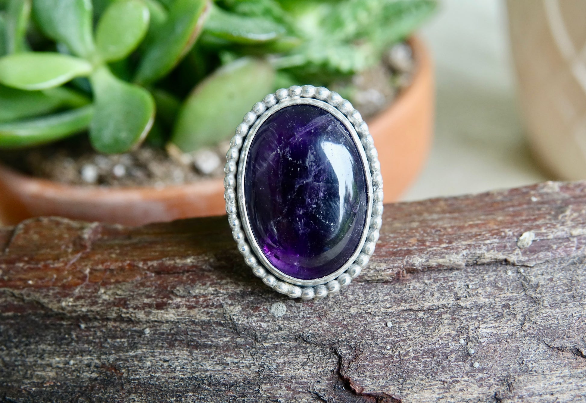 Amethyst Ring - Oval Stone with beaded accent - Size 6.5