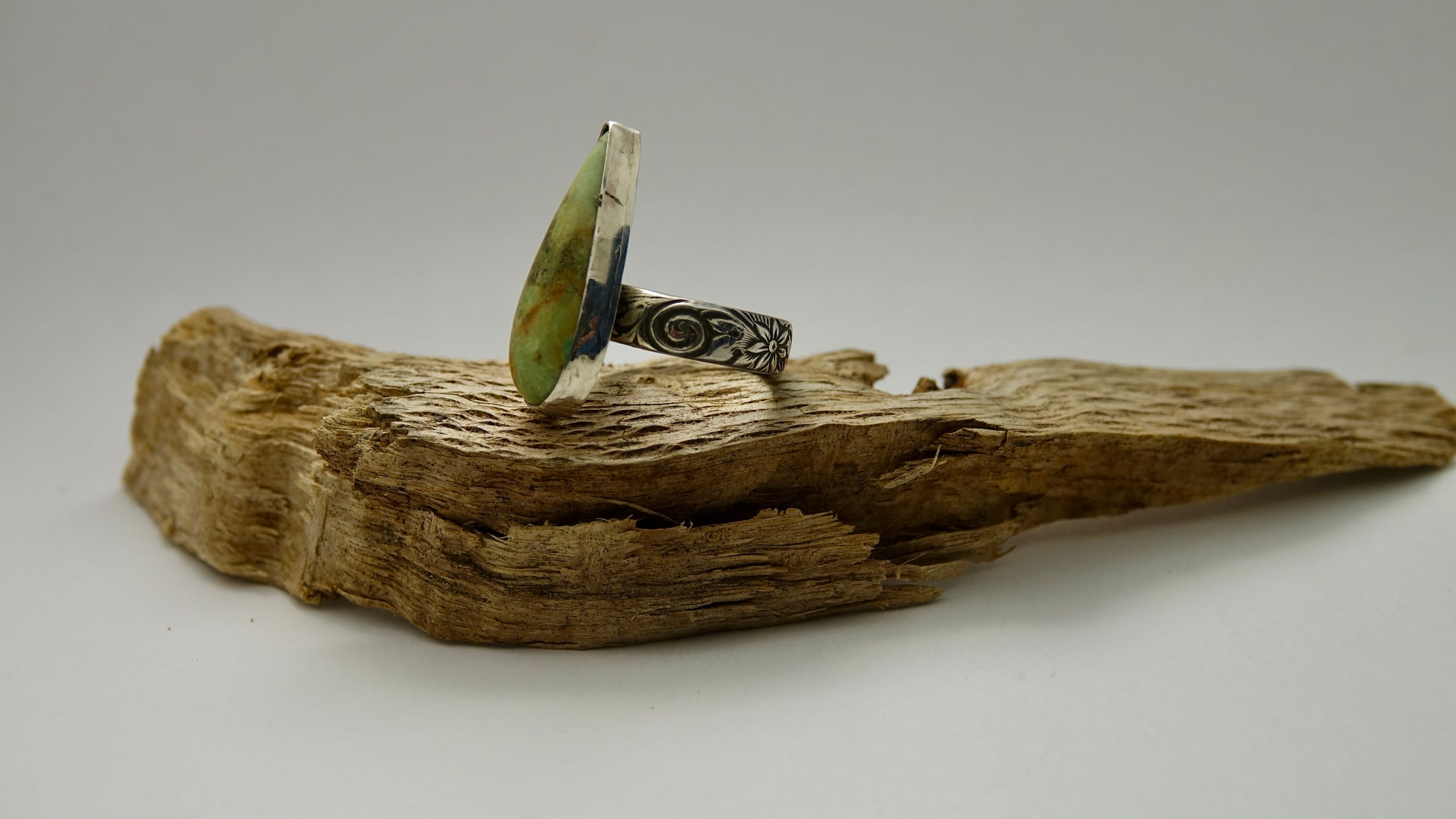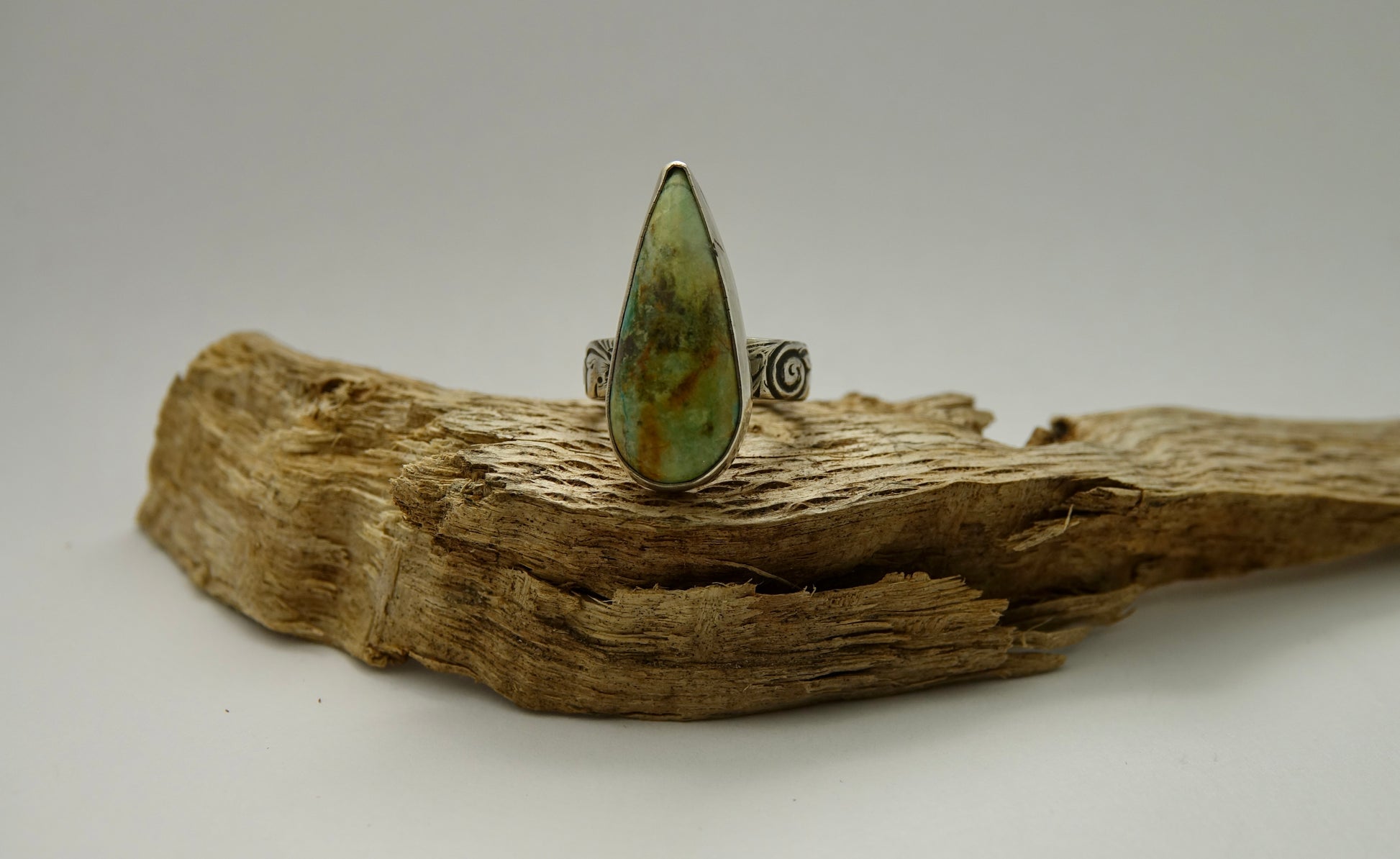 Chrysocolla Thin Teardrop shaped stone Ring on Floral Band - Size 5.5