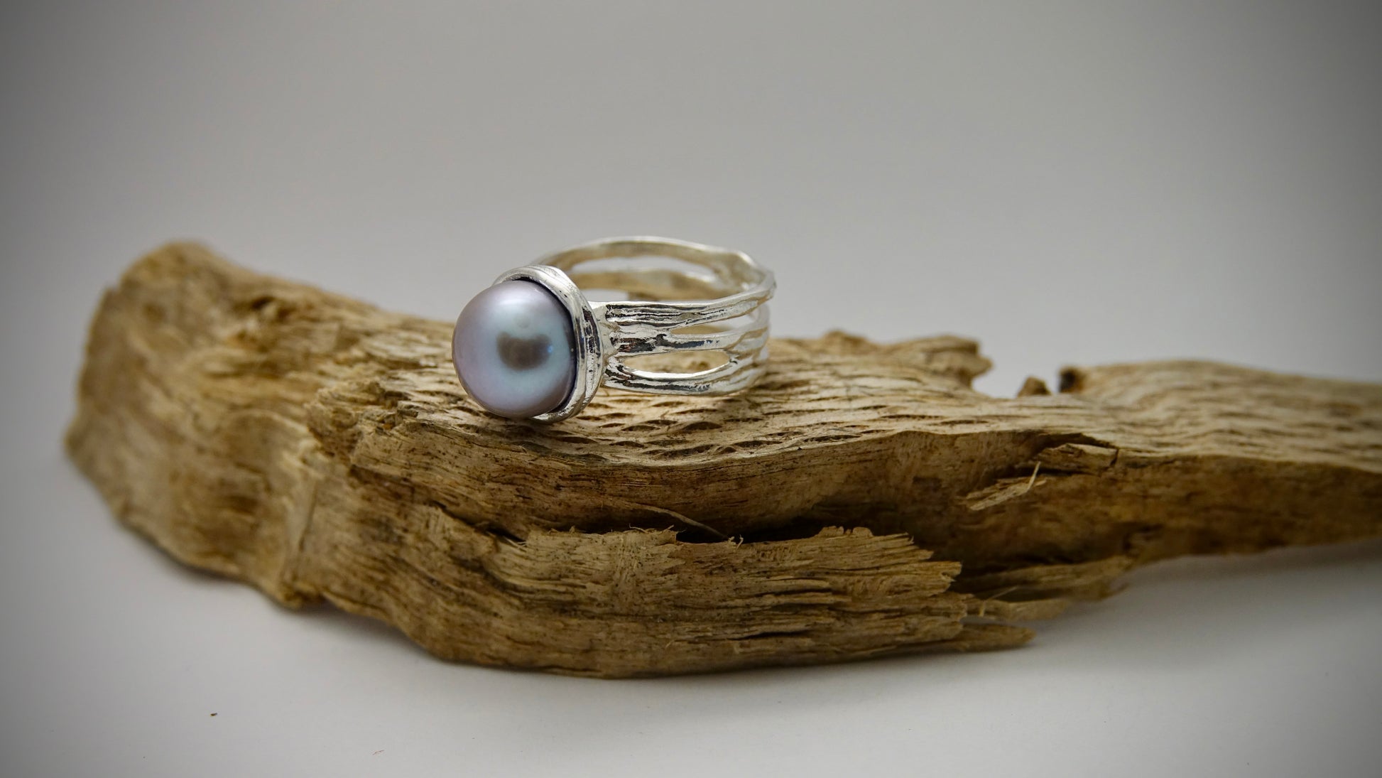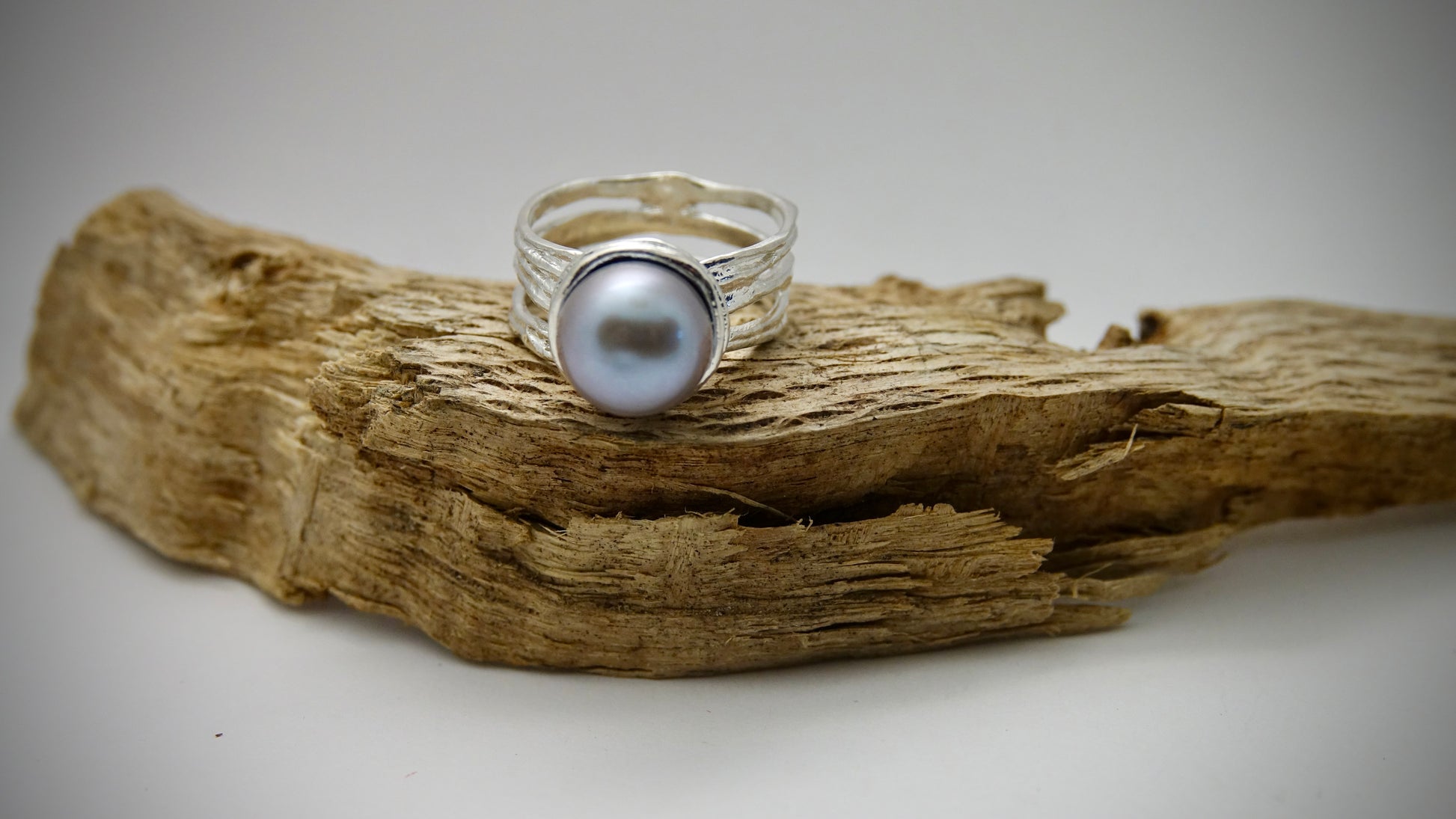 Grey Pearl Triple Band Ring - 10mm Pearl - Size 7