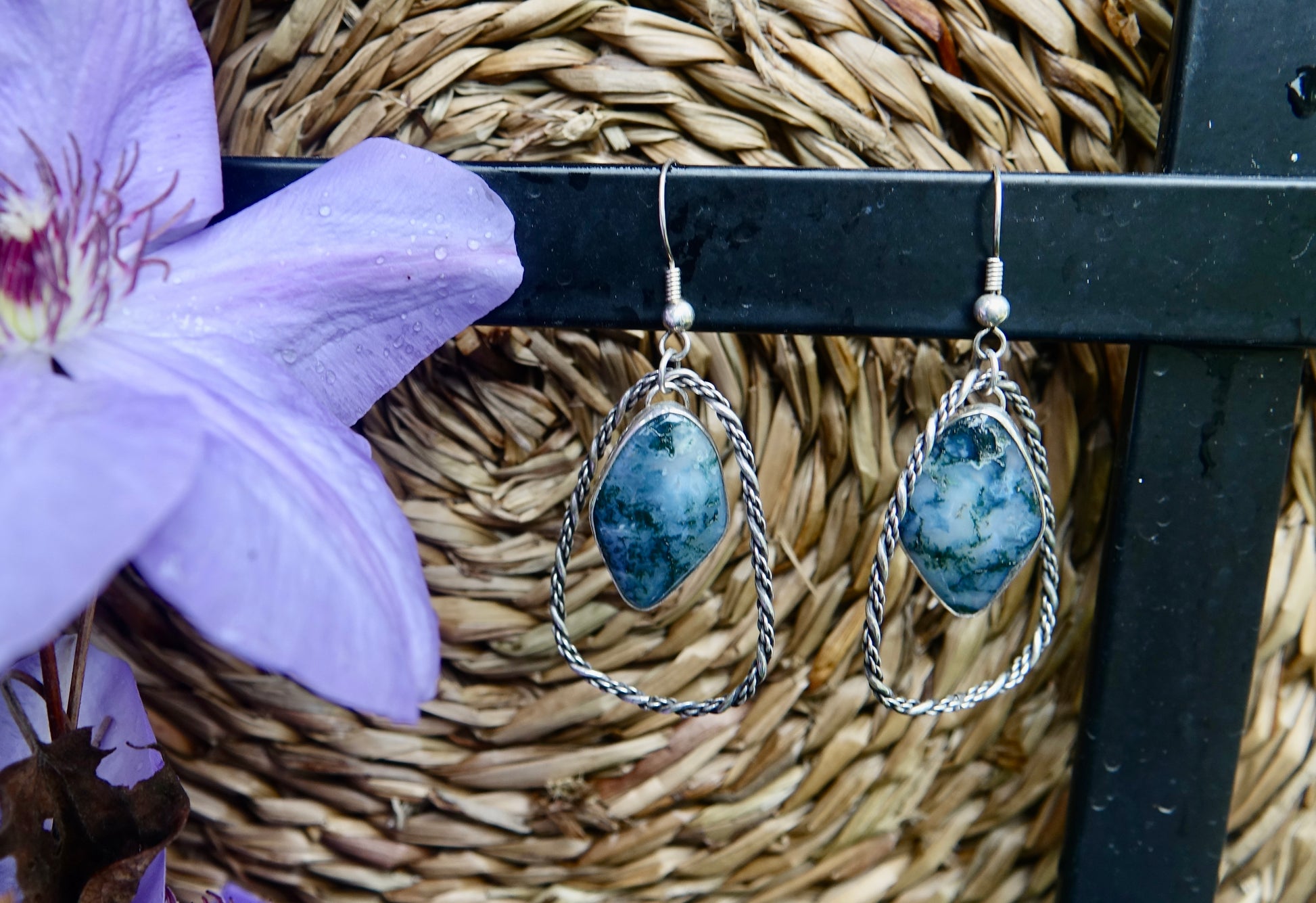 Moss Agate Diamond Shaped Earrings hanging inside Triangle Decorated Twist Hoops on Standard Sterling Silver Ear Wire