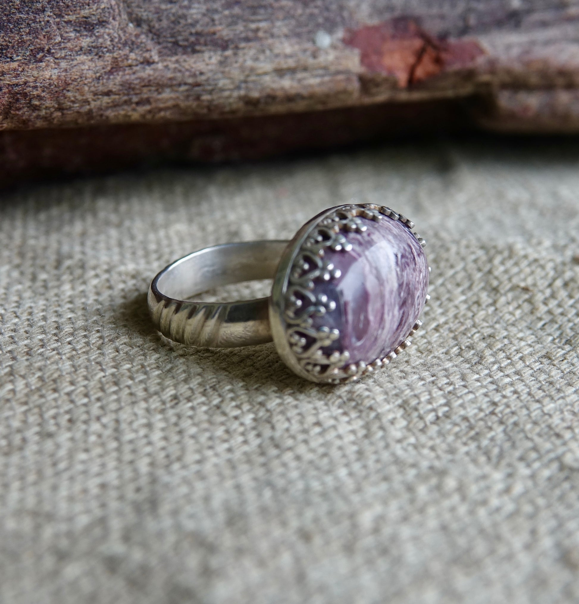 Purple Charoite Ring - Horizontal Oval Stone - Size 4.25