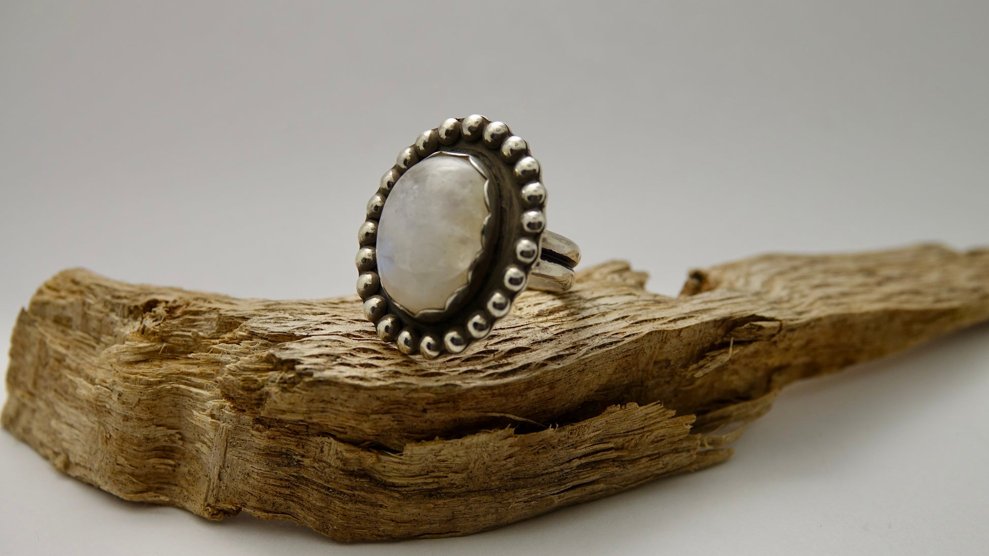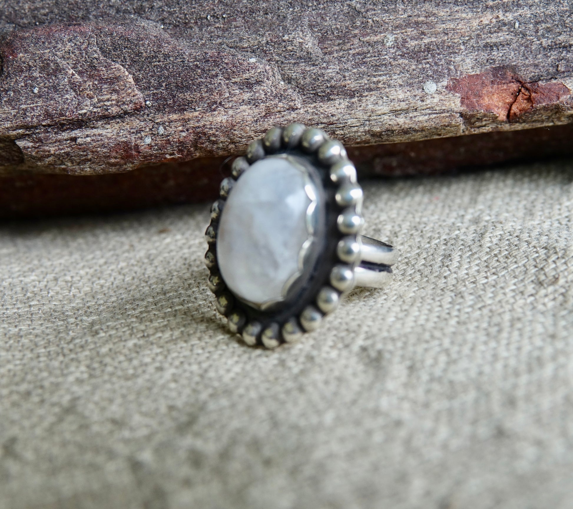 Rainbow Moonstone Ring - Oval Stone with Shadowbox style and beaded accents - Size 5