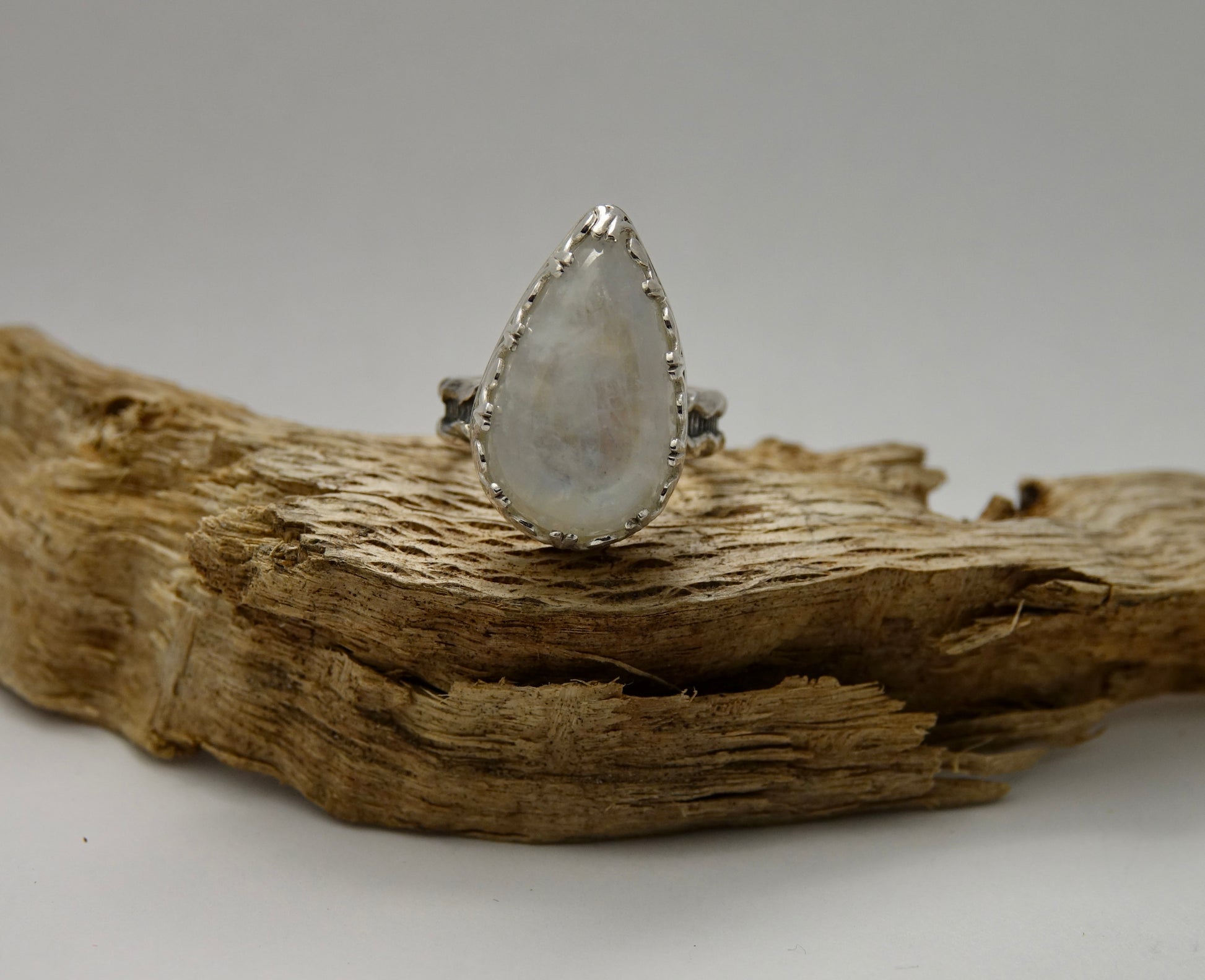 Rainbow Moonstone Ring - Teardrop Stone - Size 6.75